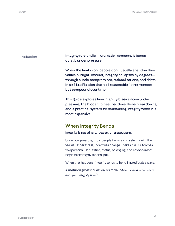 Integrity rarely collapses in dramatic moments—it bends quietly under pressure. This guide explores the three most common ways integrity breaks down for leaders when approval, outcomes, and reputation are on the line. You’ll learn a practical integrity system that helps you make decisions that are steady, defensible, and trustworthy—especially when doing the right thing is expensive.