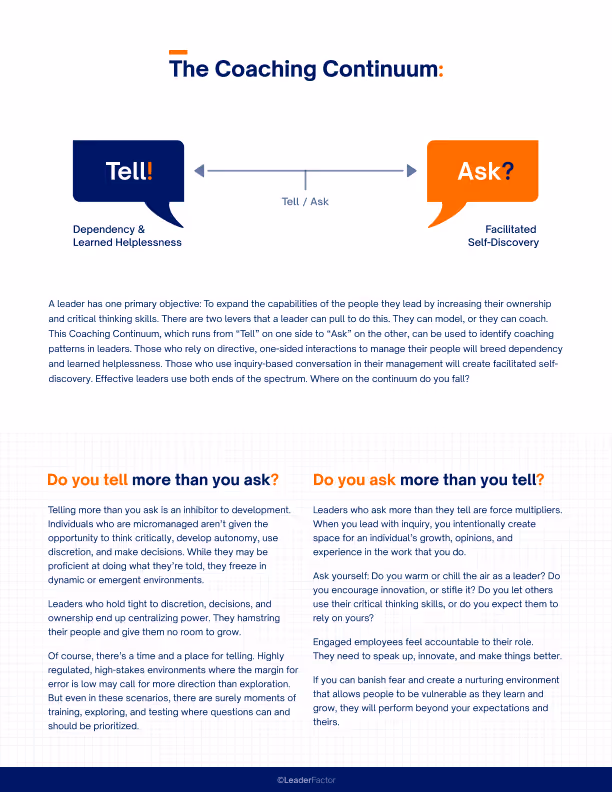 A leader has one primary objective: To expand the capabilities of the people they lead by increasing their ownership and critical thinking skills. There are two levers that a leader can pull to do this. They can model, or they can coach. Effective leaders use both ends of the spectrum. Where on the continuum do you fall?