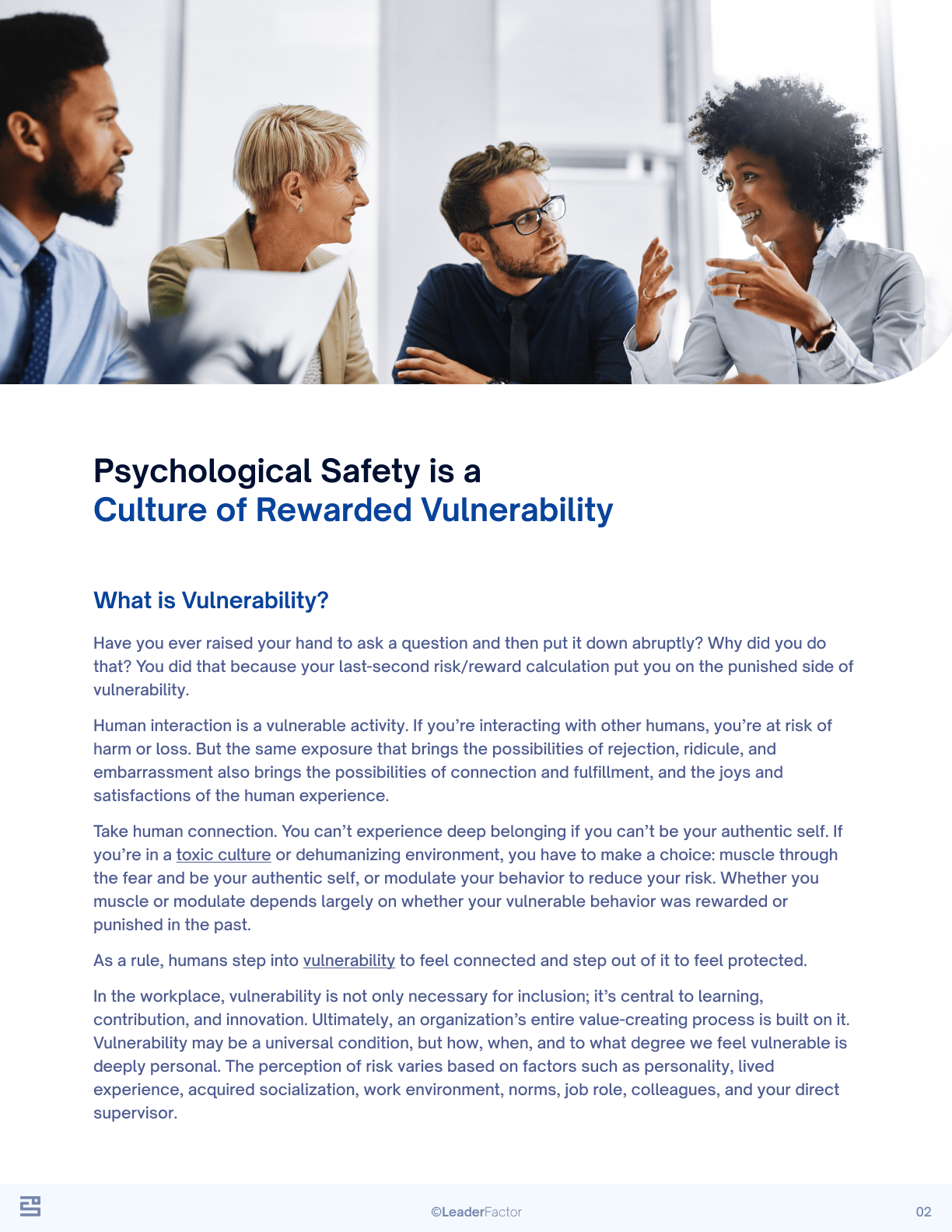 The most practical way to increase psychological safety is to model acts of vulnerability yourself and reward the vulnerable acts of others. The Ladder of Vulnerability™ will give you examples of vulnerable acts in each of The 4 Stages.