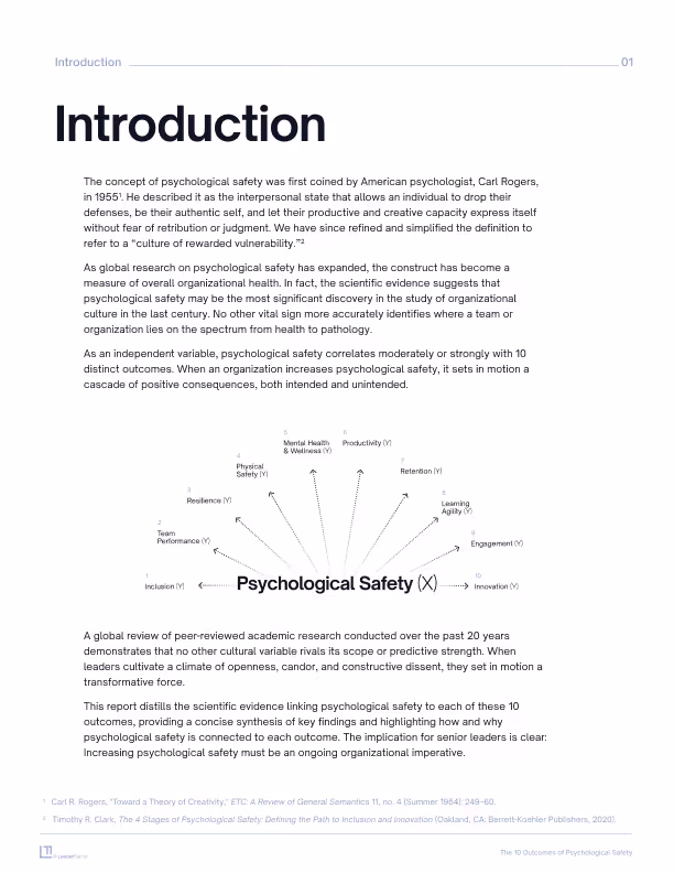 As an independent variable, psychological safety correlates moderately or strongly with 10 distinct outcomes. When an organization increases psychological safety, it sets in motion a cascade of positive consequences, both intended and unintended.