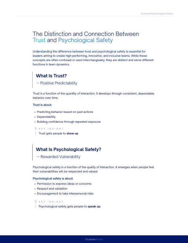 What’s the real difference between trust and psychological safety? Most leaders think having trust on their team is enough, but they’re missing half the picture. In this guide, we explain why teams can trust their leaders yet still feel unsafe to speak up, breaking down the critical distinction between positive predictability (trust) and rewarded vulnerability (psychological safety).